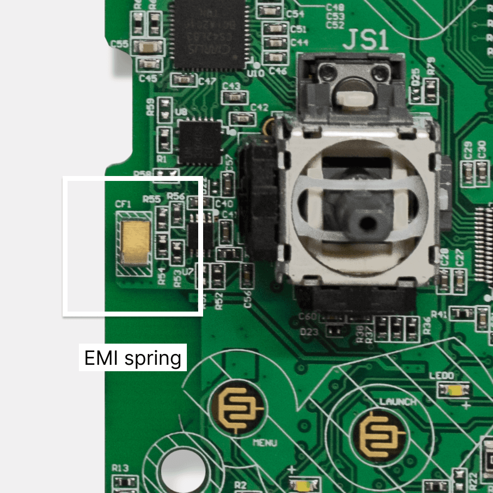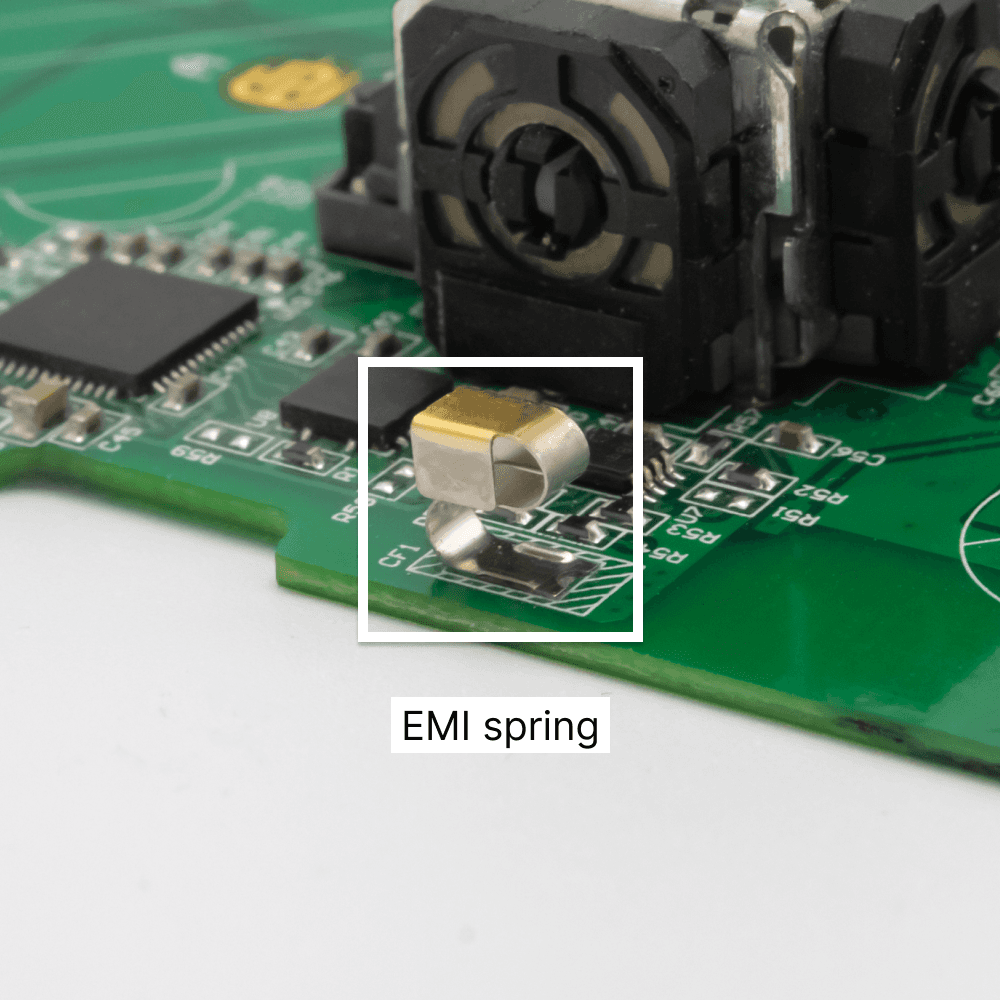 The tiny wires in the harness initially caused capacitance levels that posed a risk of antenna detuning. We integrated an EMI spring soldered onto the PCB to address this and pass Apple’s RF testing for MFi accessories.